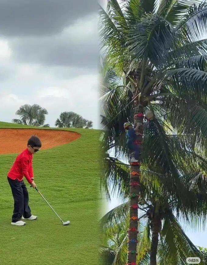 七岁的儿子继承了妈妈的好身材,挥动高尔夫球杆时有模有样,爸爸就在一旁温柔指导。